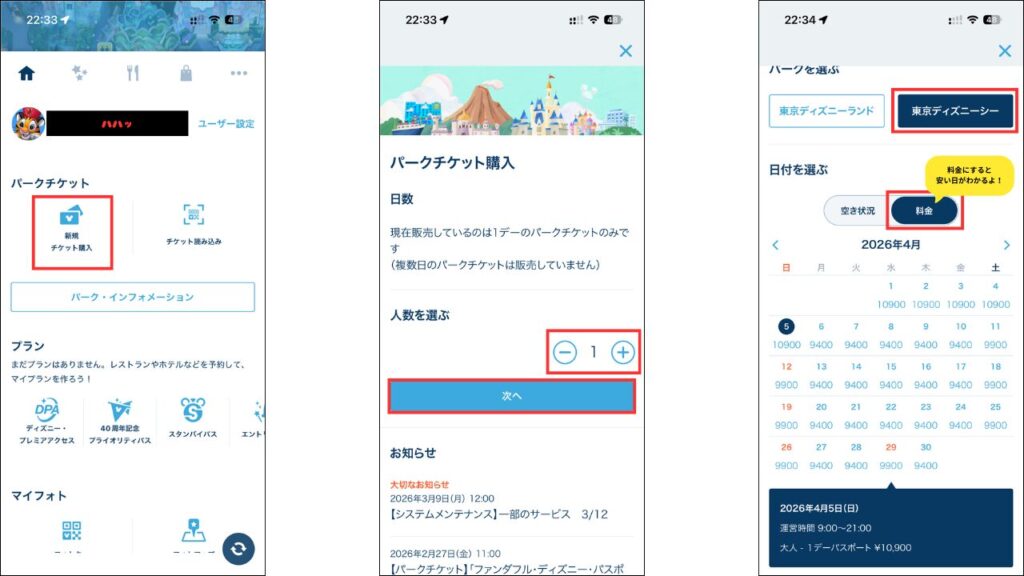 「新規チケット購入」を押下し、チケット購入枚数を選択、パークを選択します!