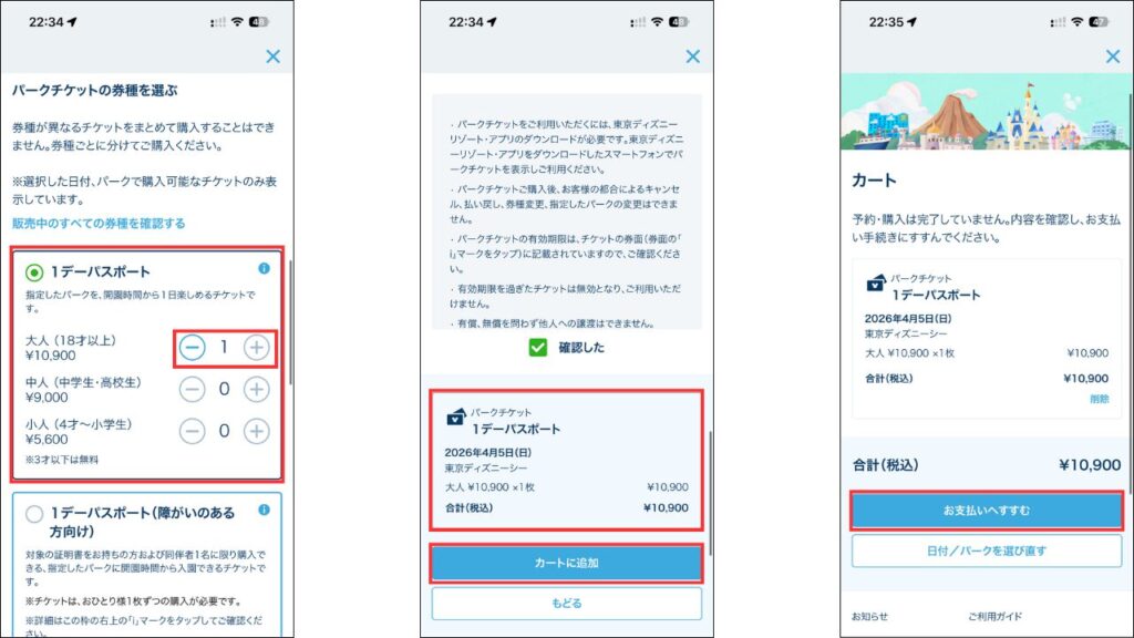 次にパークチケットの券種を選択しカートを追加します。