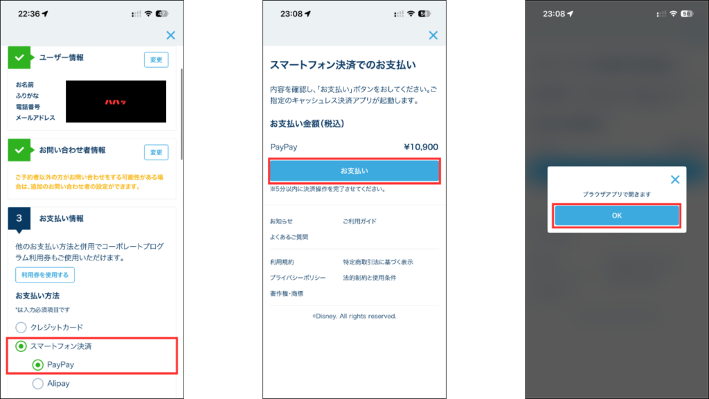 ユーザー情報や支払い方法を選択し、支払いを確定します。