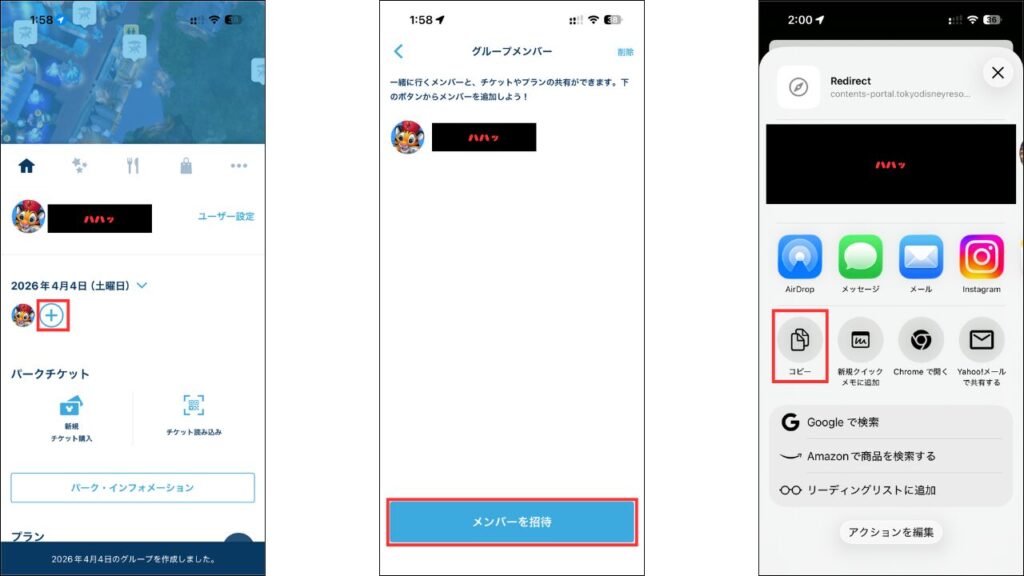 パークへ行く当日までに以下の方法でグループを作成しておきましょう!